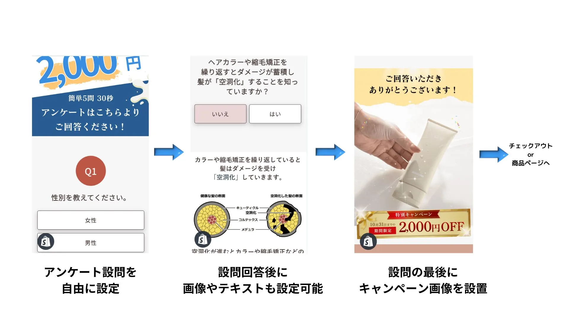 Shopifyのテーマテンプレートに構築ができますので、一度構築してしまえばその後はノーコードで設問内容のPDCAを回す事ができます。