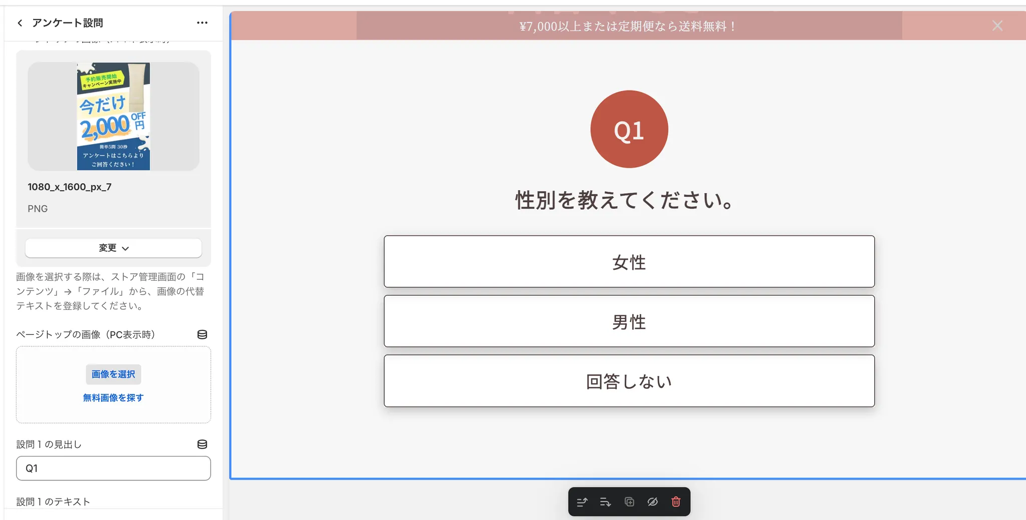Shopifyのテーマ上に構築しますので、設問の内容や画像などはノーコードで自由に編集が可能です。
